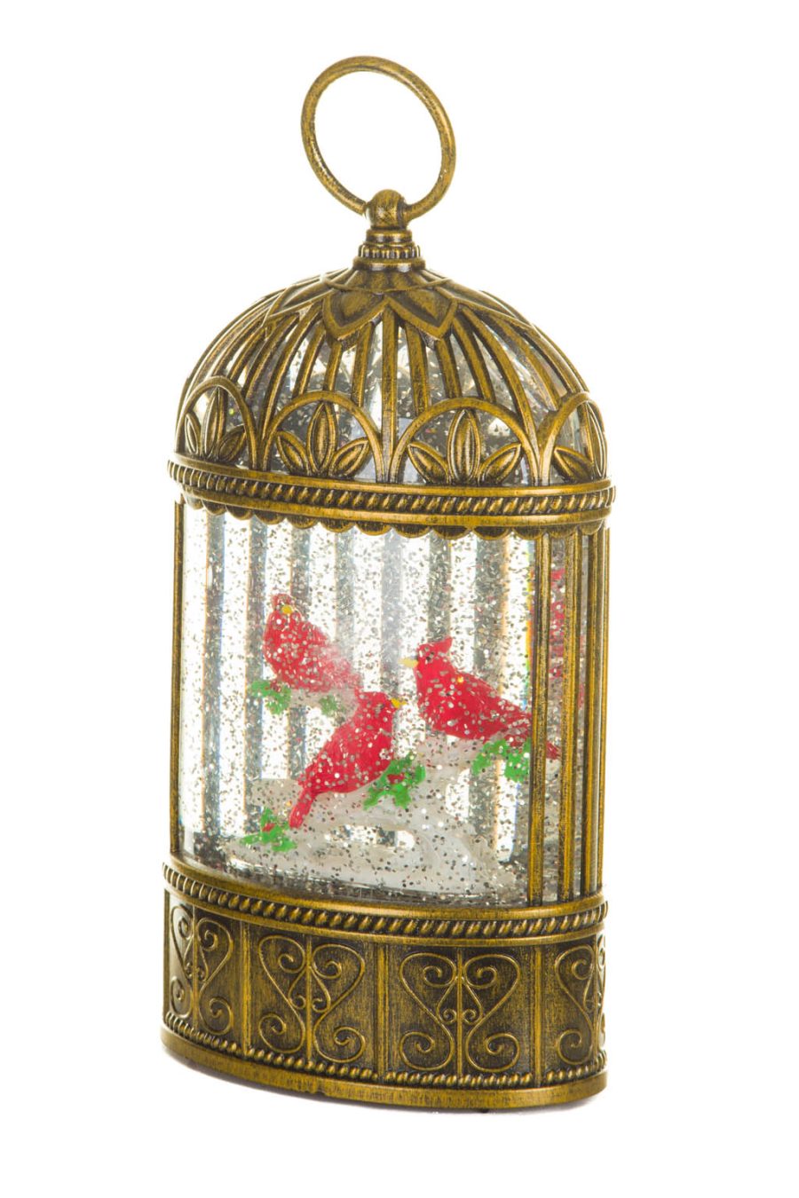 SKU: CB9056Rustic Gold Birdcage Warm White LED Snow Globe with Cardinals