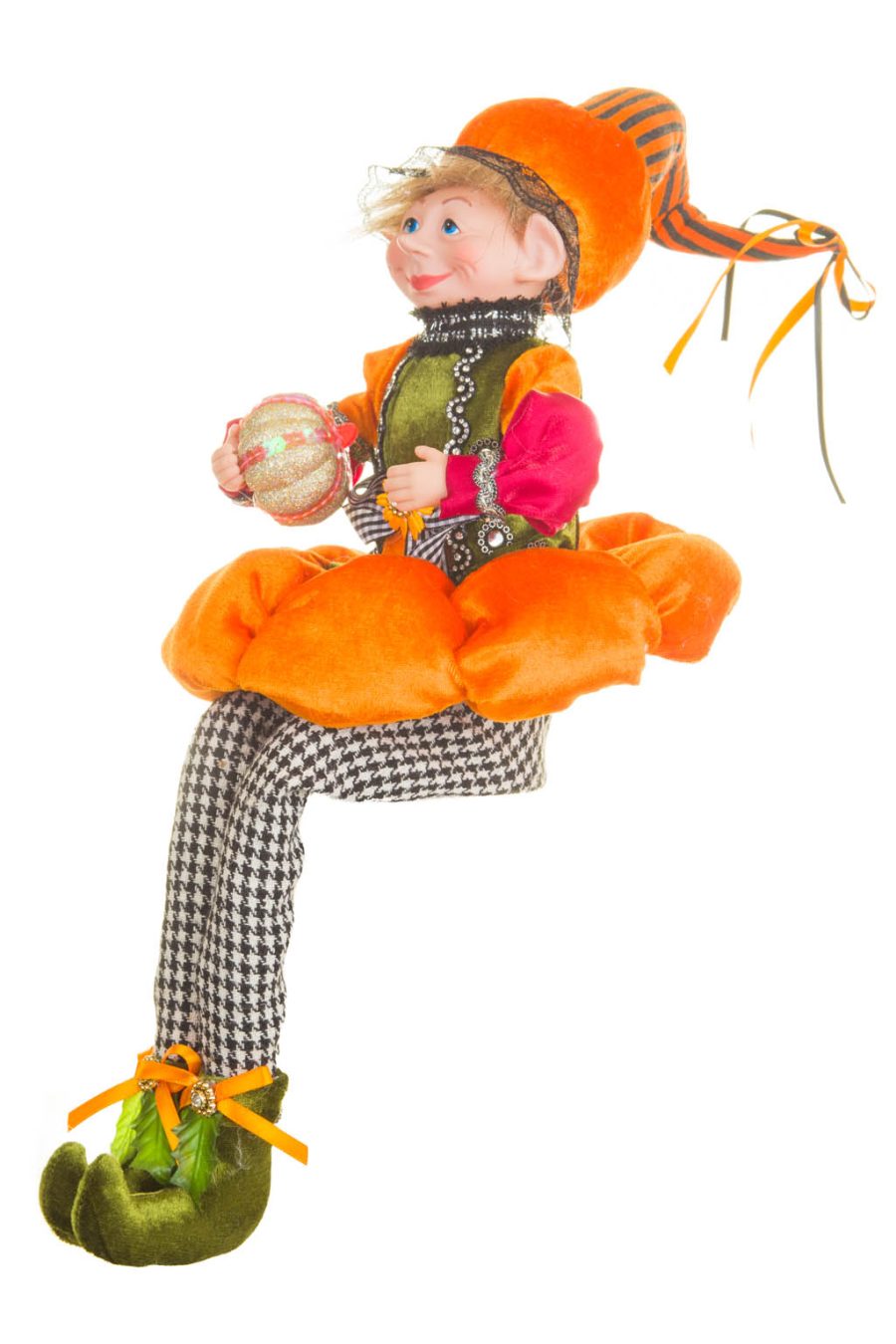 SKU: ST4448Sitting Orange and Green Velveteen Impish Elf in Pumpkin Motley Suit