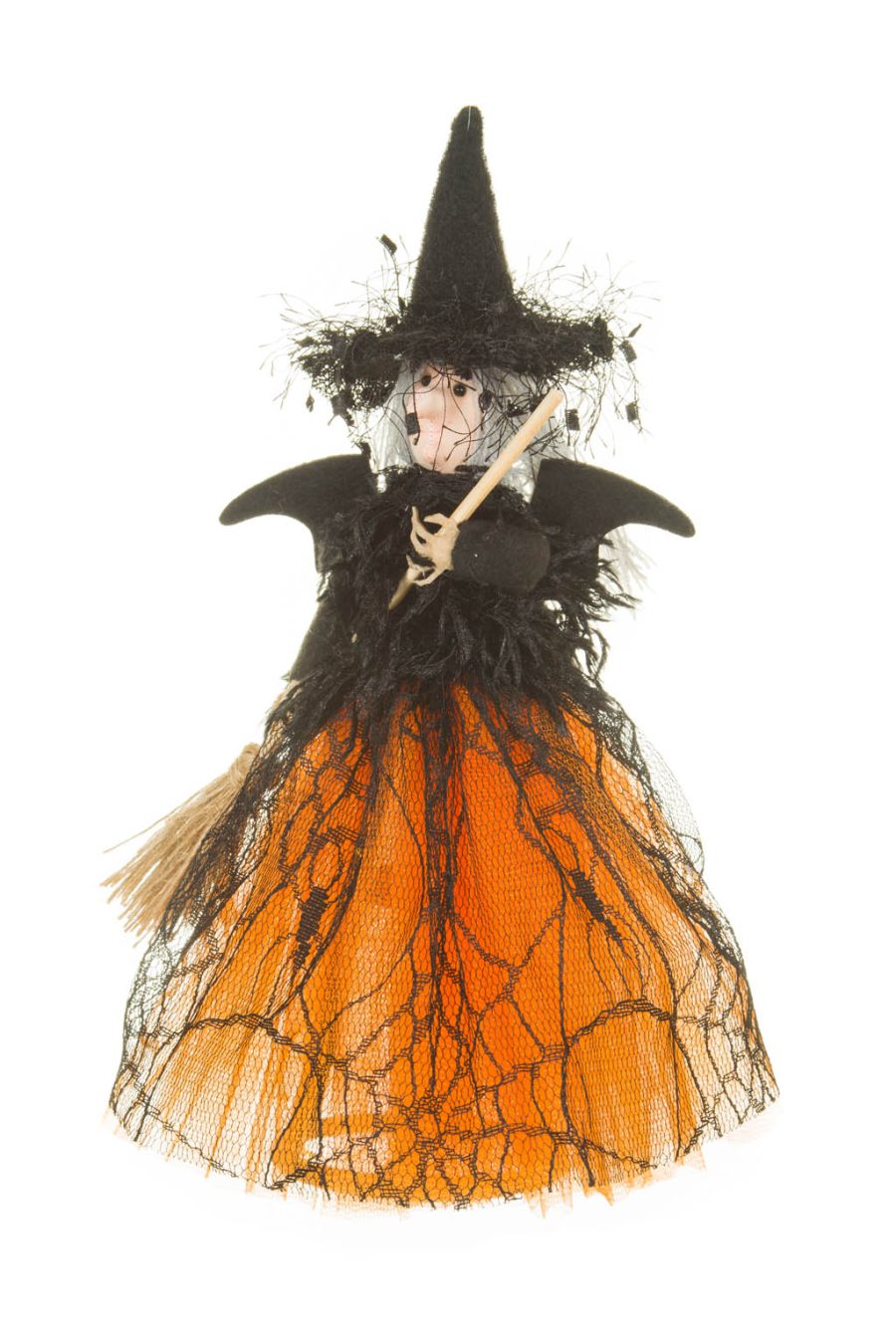 Captivating Sitting Orange and Black Witch with a Broom and Black and Gray Hair
