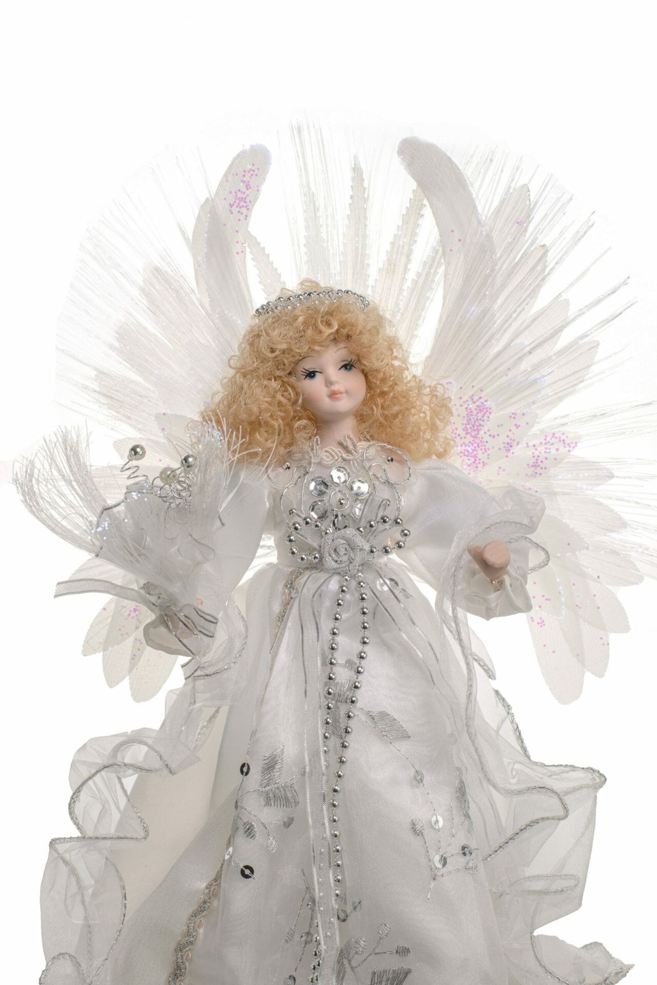This pure, solemn Angel has a beautiful White Gown sure to complete your tree with its classic splendor and pure aesthetic.