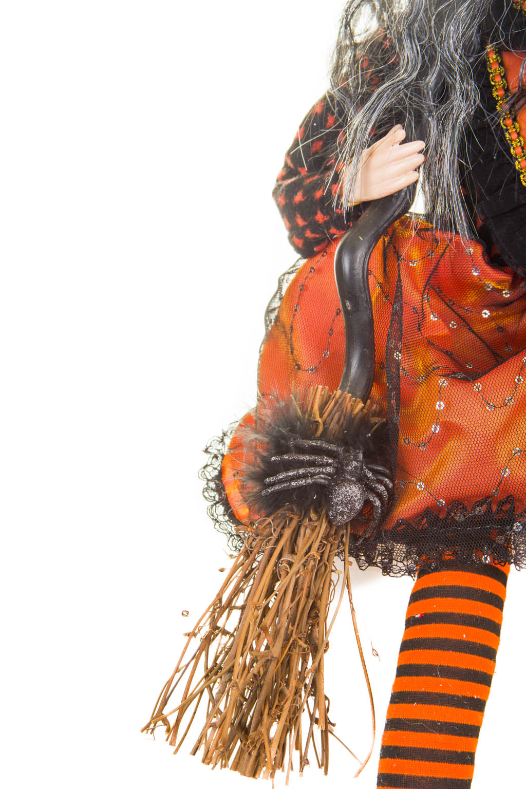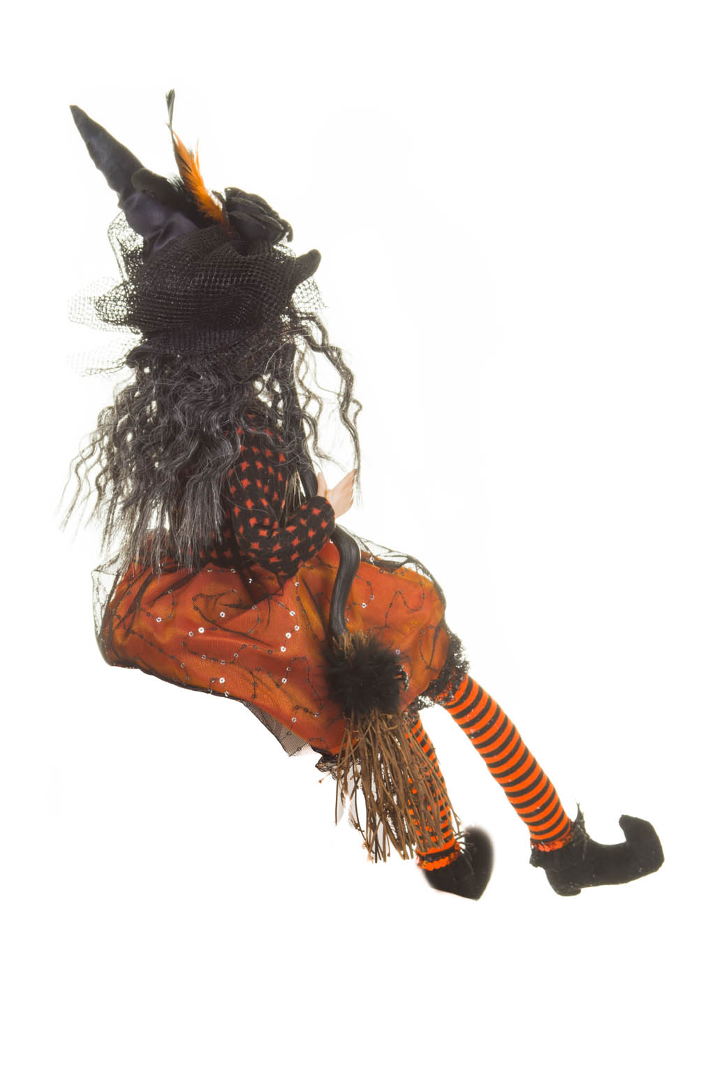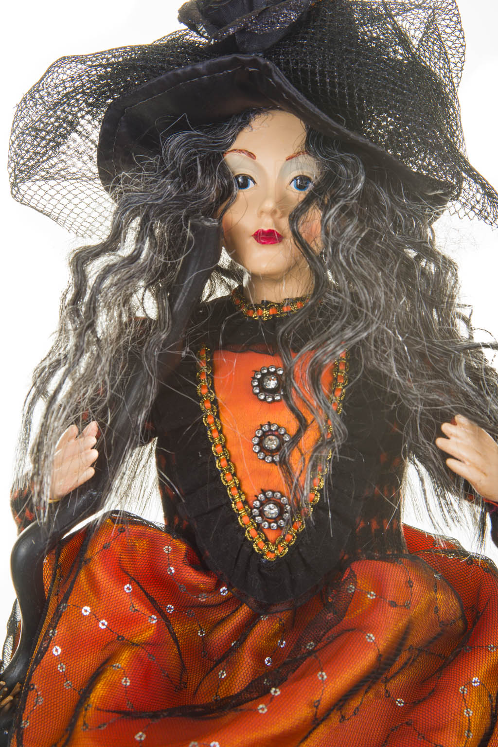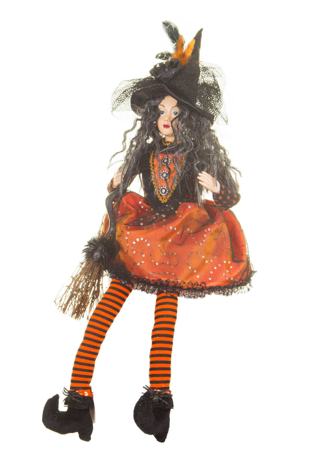 Captivating Sitting Orange and Black Witch with a Broom and Black and Gray Hair