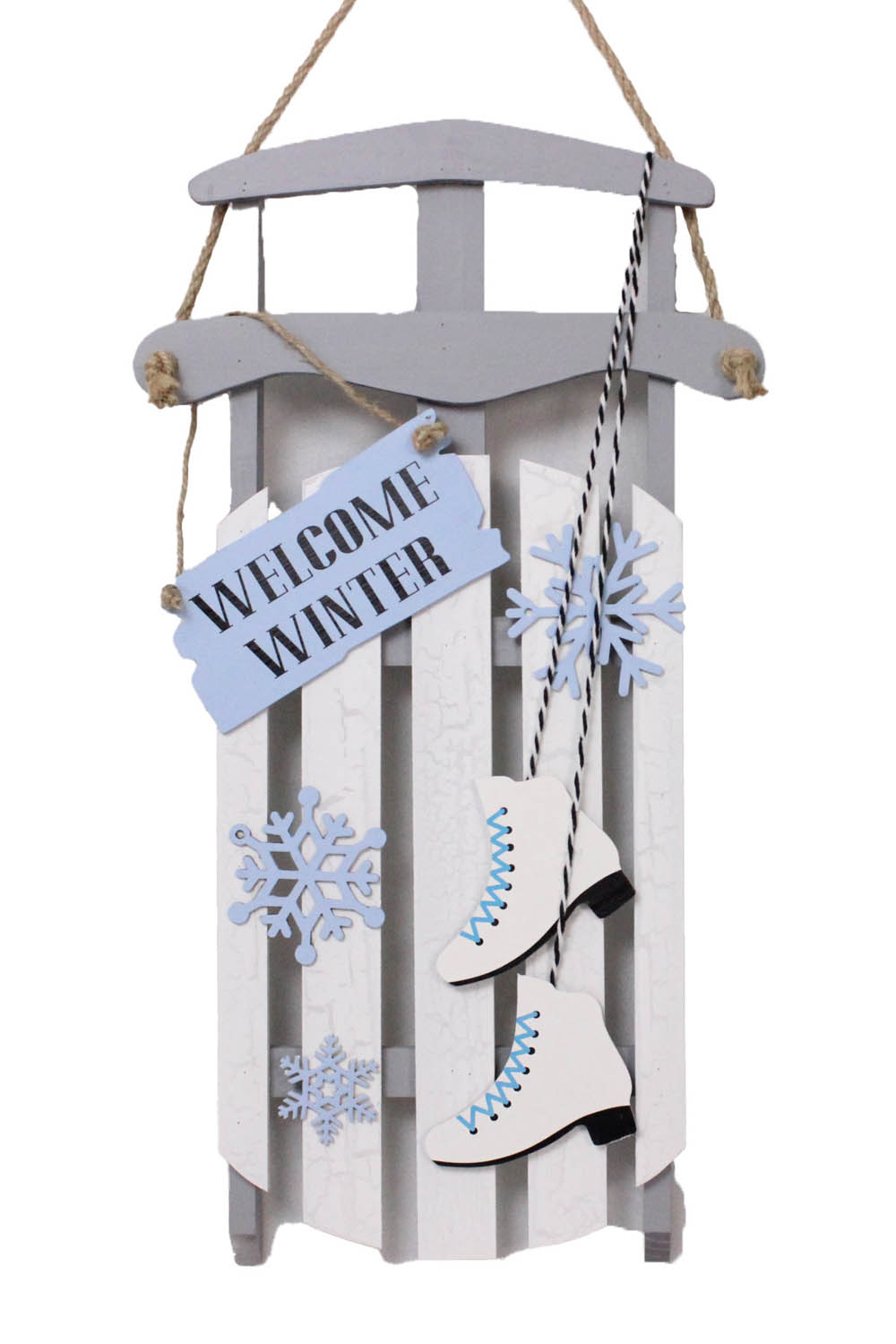 Hangable White and Gray Wall-Mounted Brumal Sled with “Welcome Winter” Sign