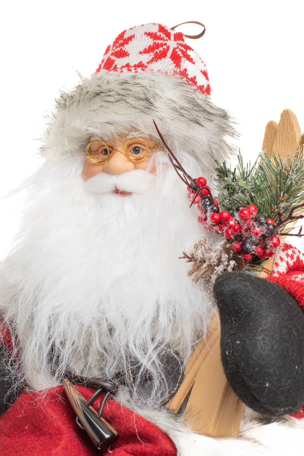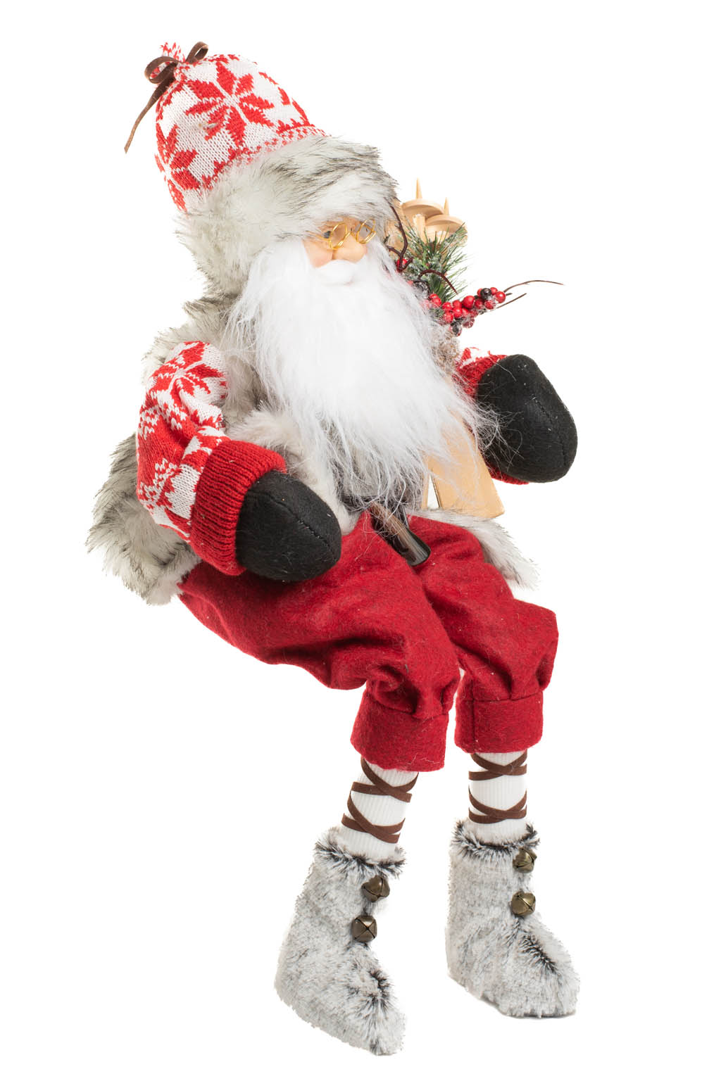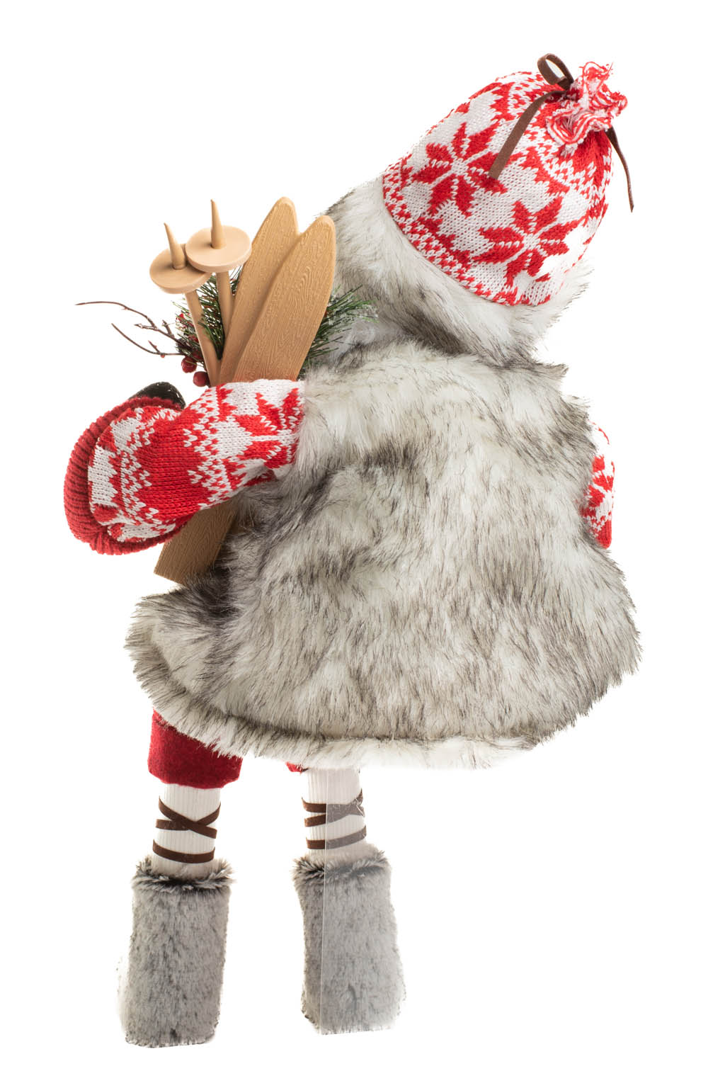 Sitting Red and White Snowflake Alpine Santa with Skiis and Boots with the Fur