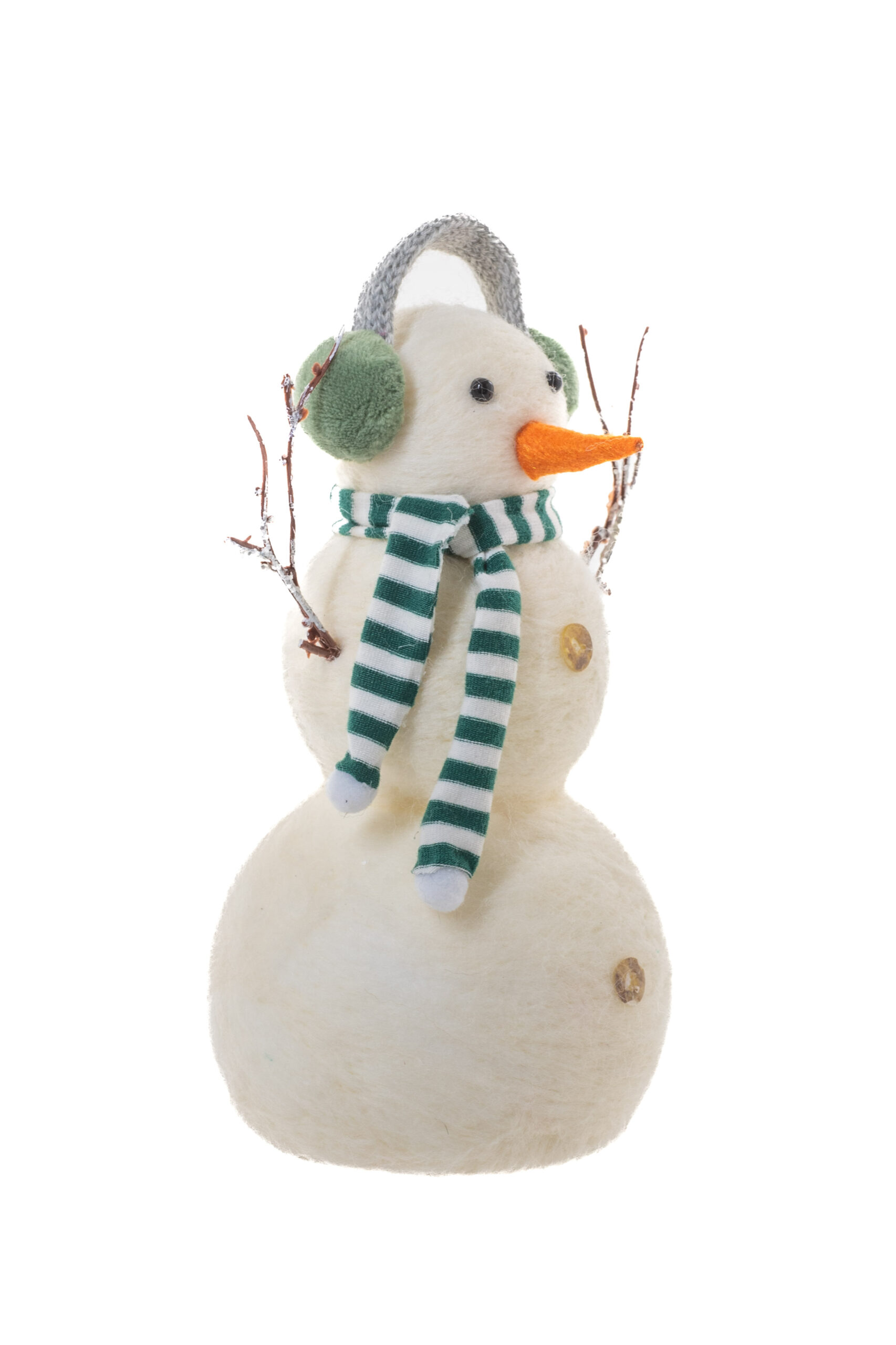 White Polylon Standing Big Brother Snowman with Green Earmuffs and Scarf